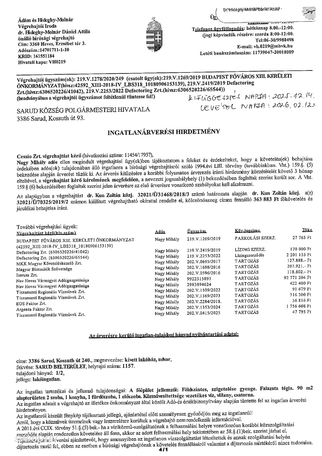 Ingatlanárverési Hirdetmény 1157 hrsz- Sarud